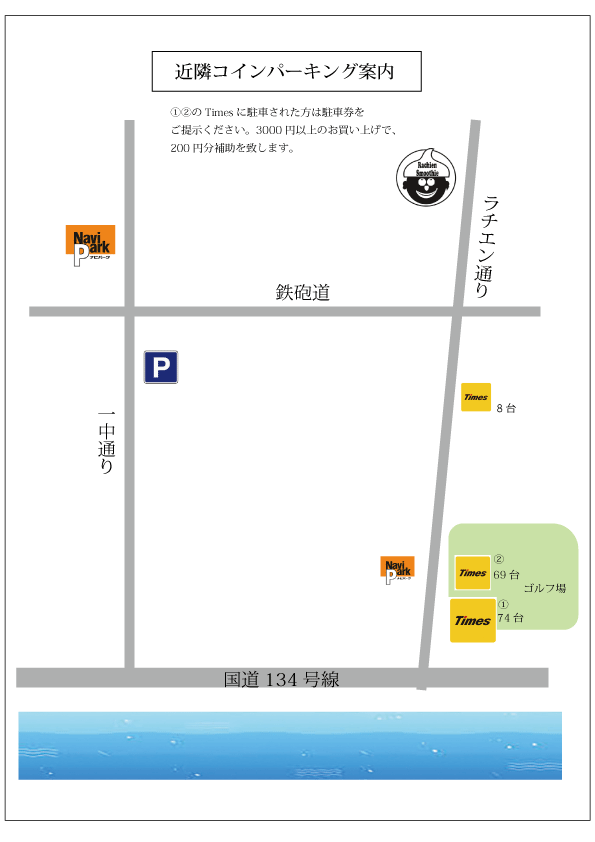 近隣のコインパーキングにお願い致します。一番近いパーキング(Times)から当店までは徒歩3分程度。